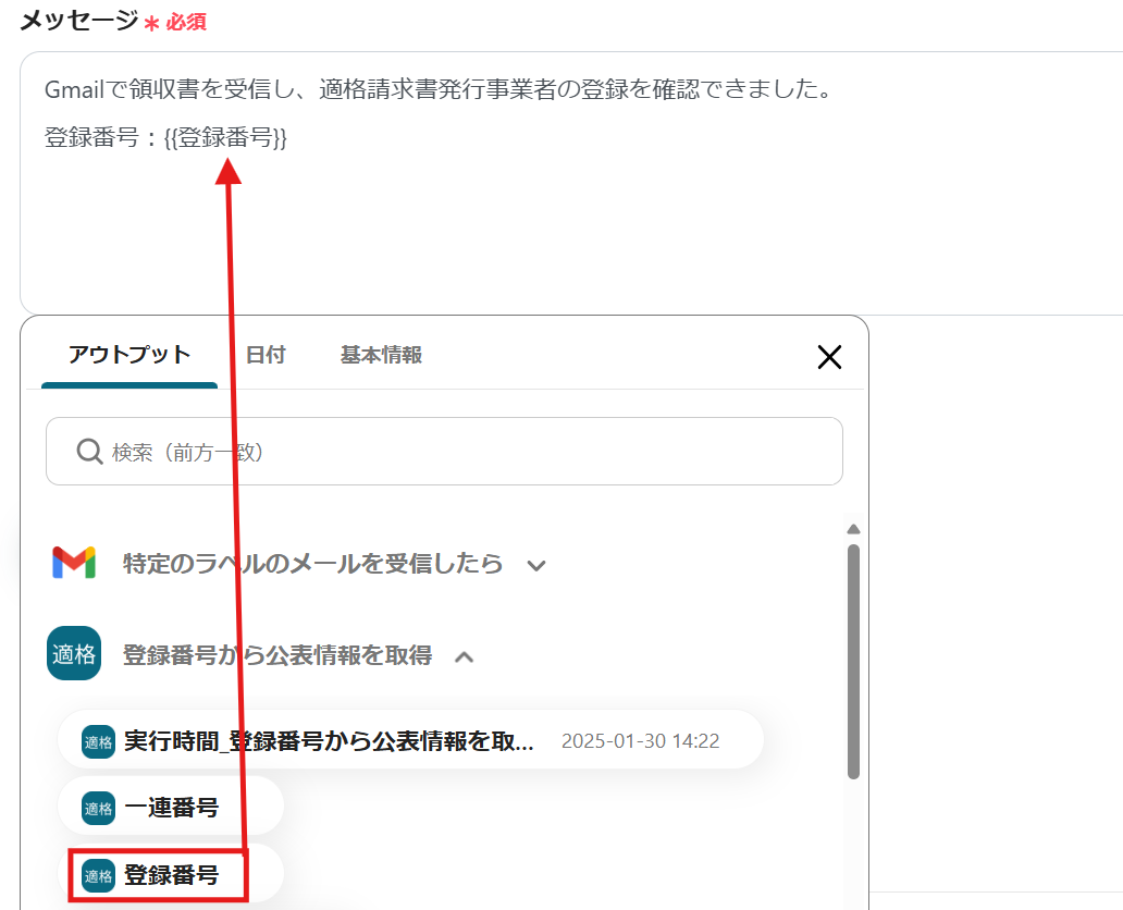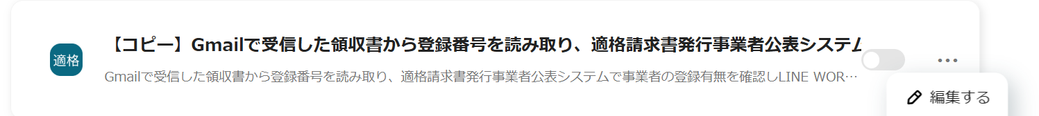 しかしこの自動化フローは、Gmailで受信した領収書から登録番号を自動的に抽出し、適格請求書発行事業者公表システムで登録状況をすぐに確認します。