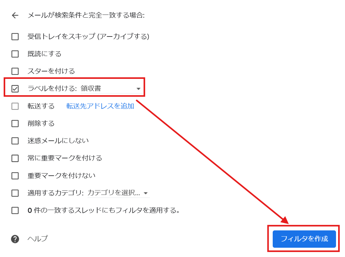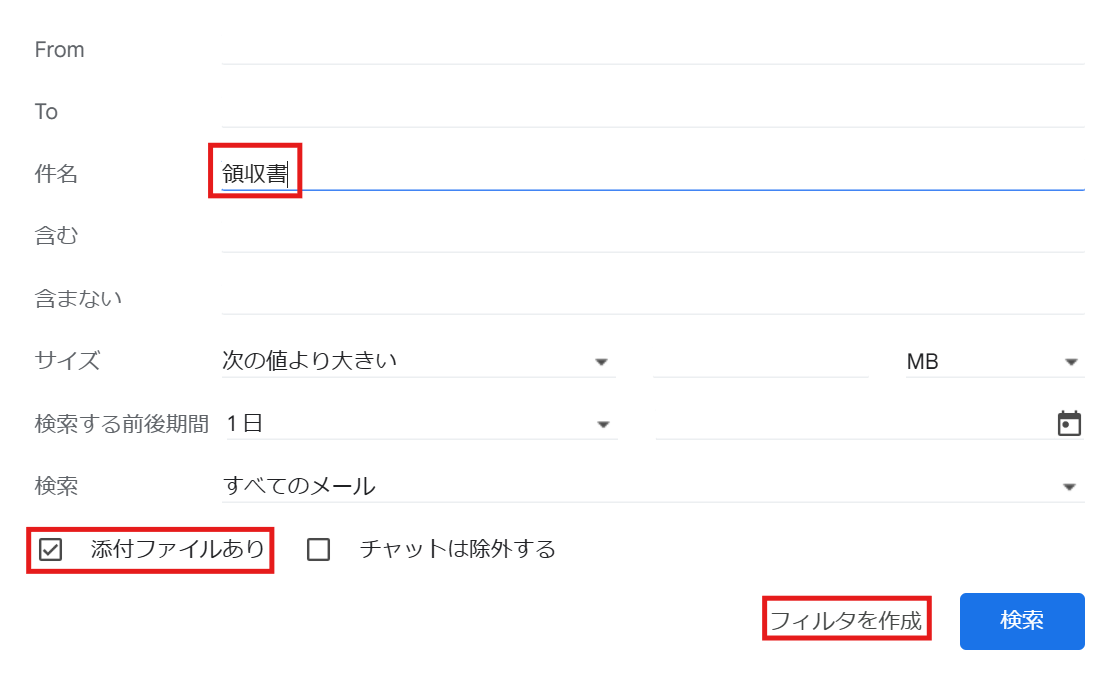 件名に「領収書」→添付ファイルありを選択し、フィルタを作成します。