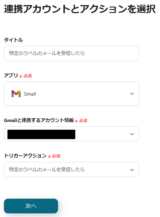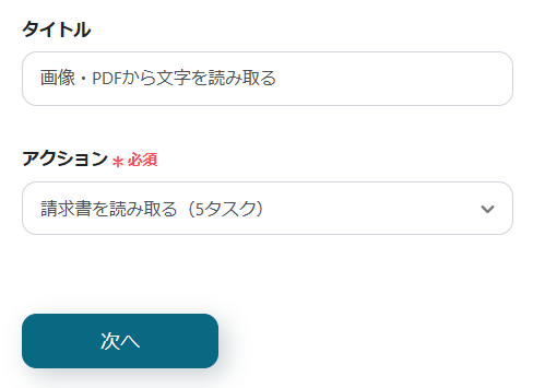 2.タイトルとアクションが下記のようになっていることを確認し、「次へ」をクリックします。