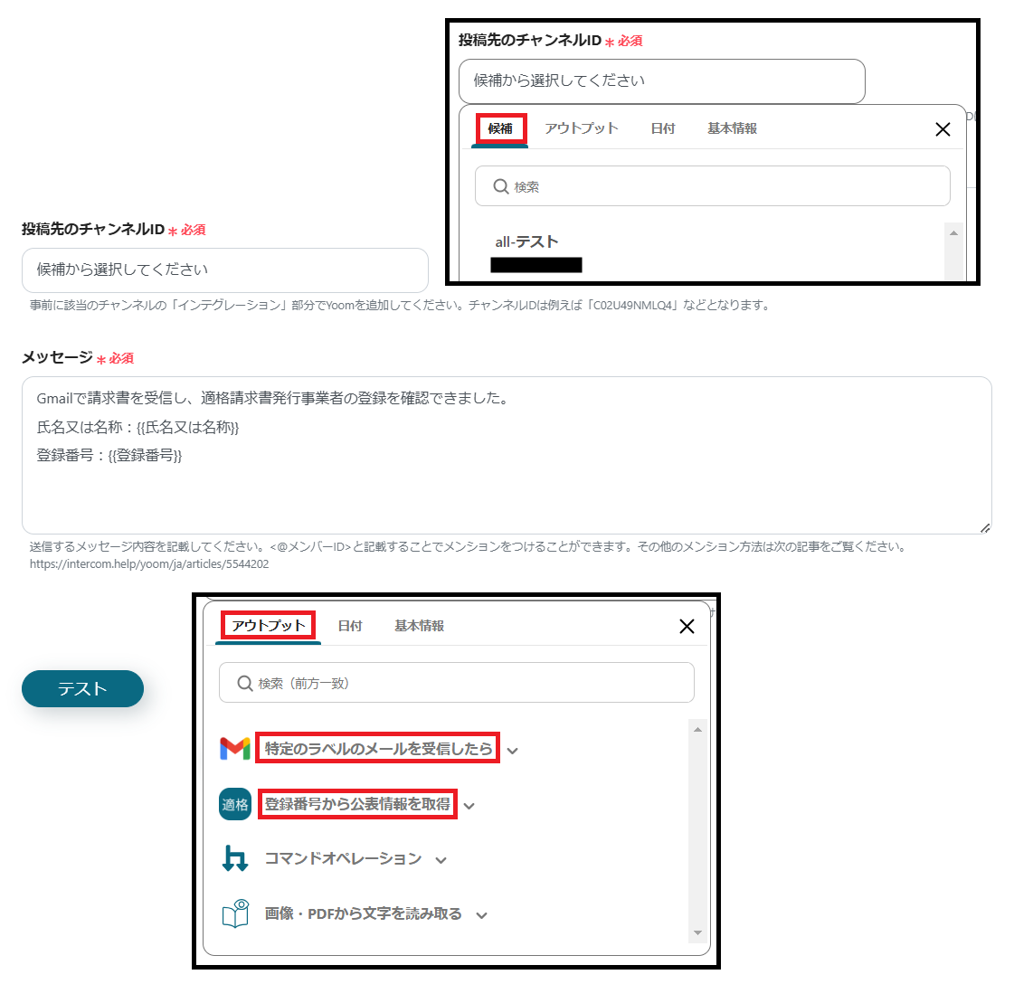 ※メッセージには、定型文を直接入力できます。また、Gmailや適格請求書発行事業者公表システムの情報を反映させる場合は、アウトプットの「特定のラベルのメールを受信したら」や「登録番号から公表情報を取得」から設定します。(値は二重括弧で表示されます)