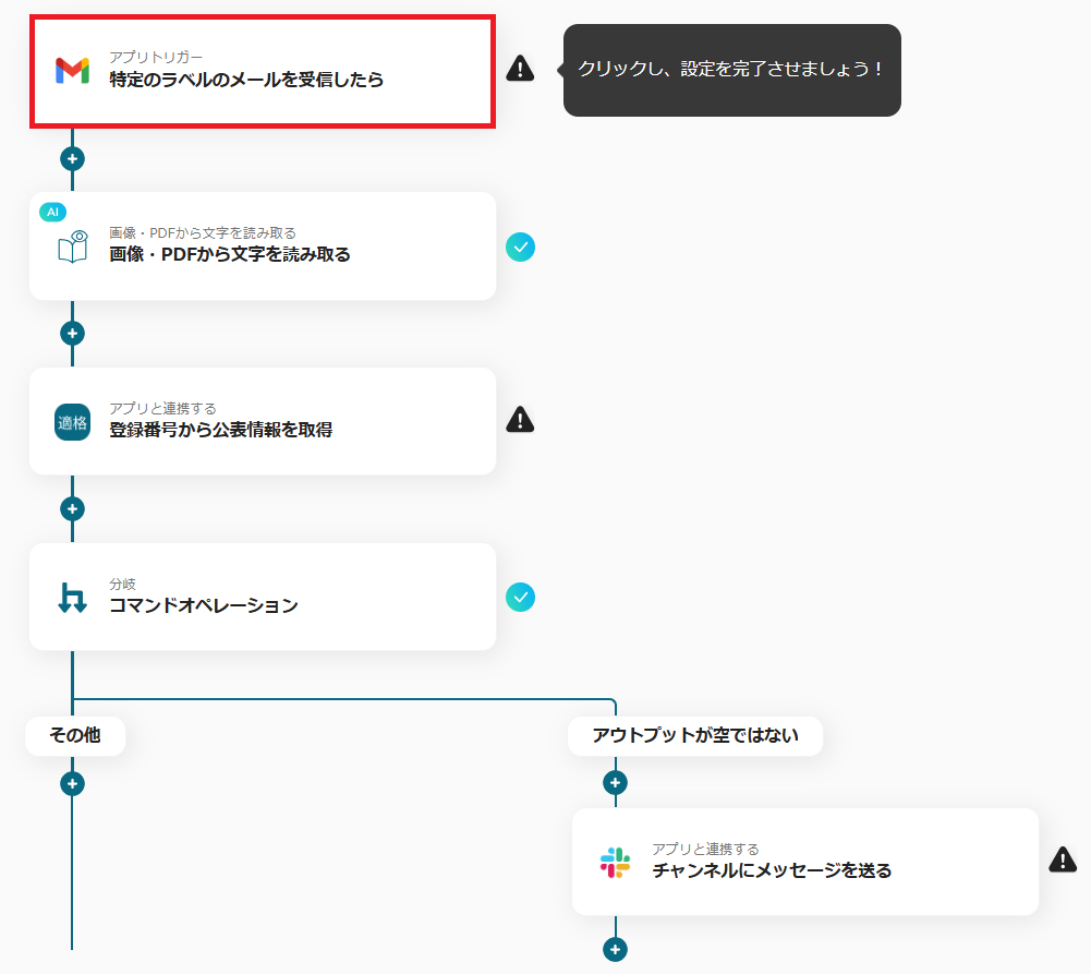 5.トリガーをONにすると、Gmailで特定のラベルのメールが受信されるたび、請求書から登録番号を自動で読み取り、適格請求書発行事業者公表システムで登録の有無を確認し、Slackに通知されます。