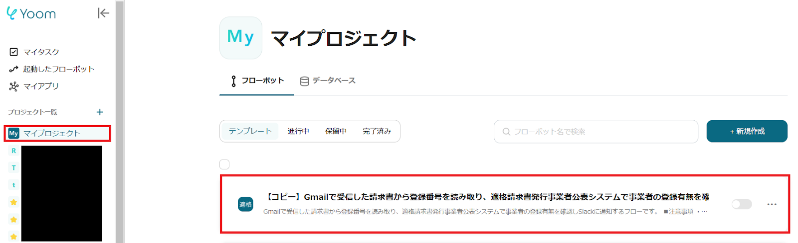 1.Yoom管理画面の「マイプロジェクト」を選択し、「【コピー】Gmailで受信した請求書から登録番号を読み取り、適格請求書発行事業者公表システムで事業者の登録有無を確認しSlackに通知する」をクリックします。
