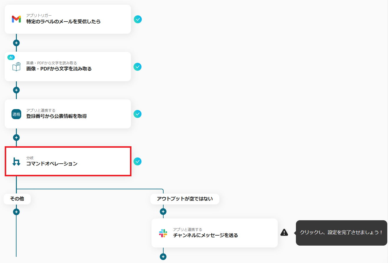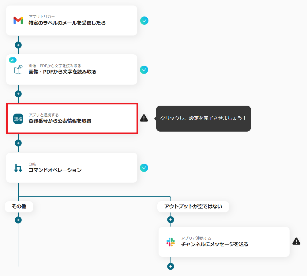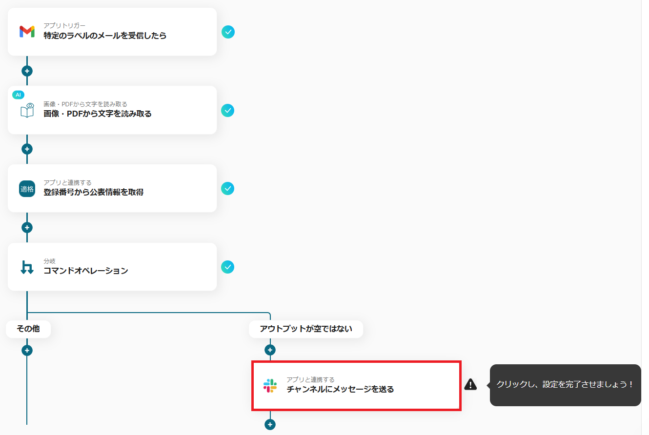 最後に、登録番号が実在した場合にSlackに通知する設定を行います。