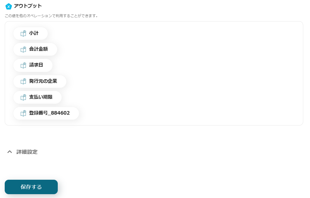 ※登録番号は、枠をクリックして表示されるアウトプットの「画像・PDFから文字を読み取る」から設定します。(値は二重括弧で表示されます)