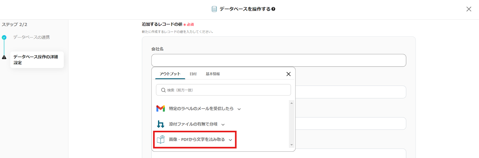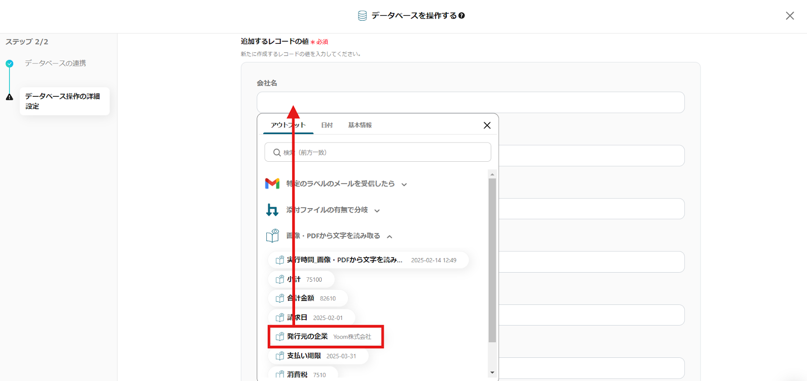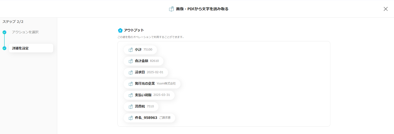次に、添付されているファイルの内容をAI-OCRで読み取り、「会社名、金額、日付」などの文字を抽出してデータ化することが可能です。