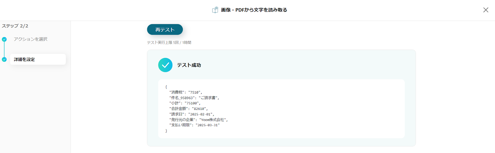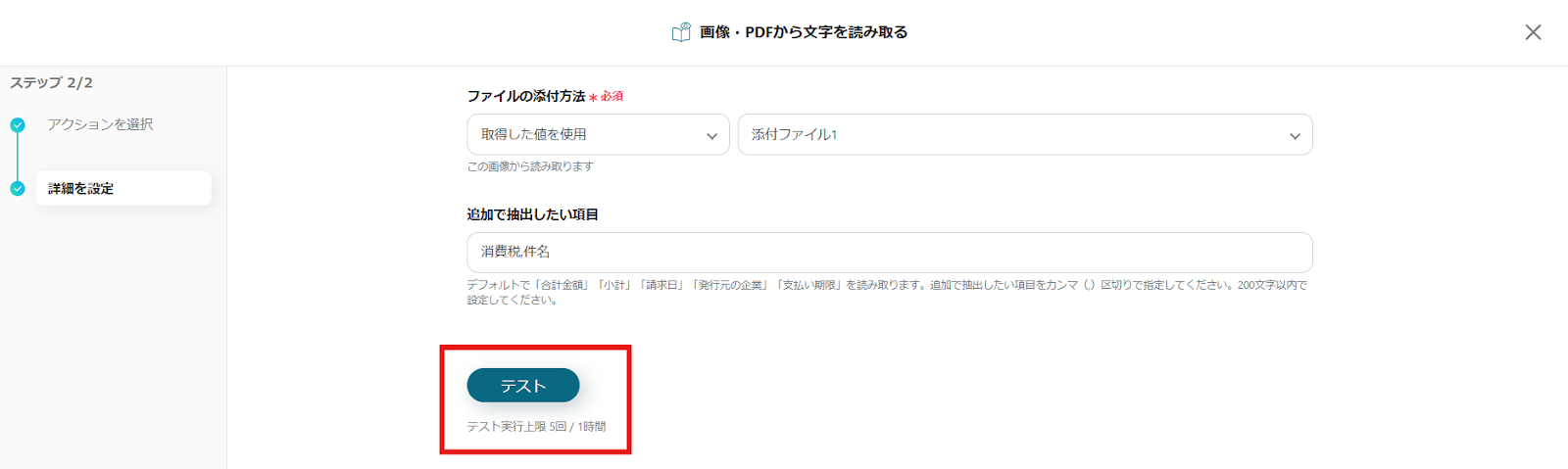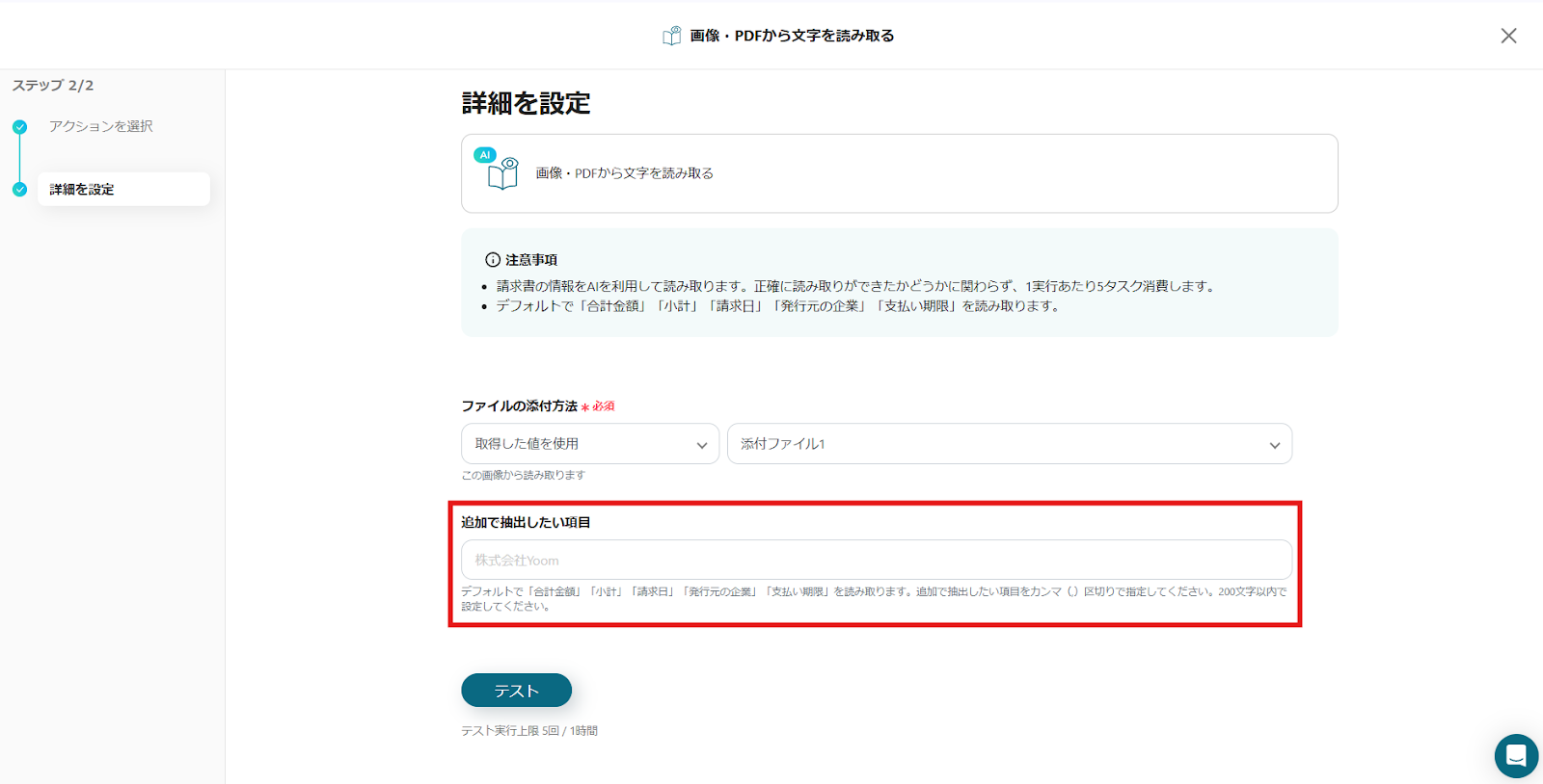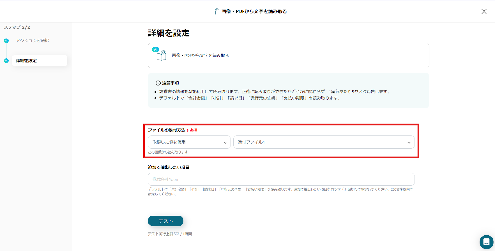 次に、添付されているファイルの内容をAI-OCRで読み取り、「会社名、金額、日付」などの文字を抽出してデータ化することが可能です。