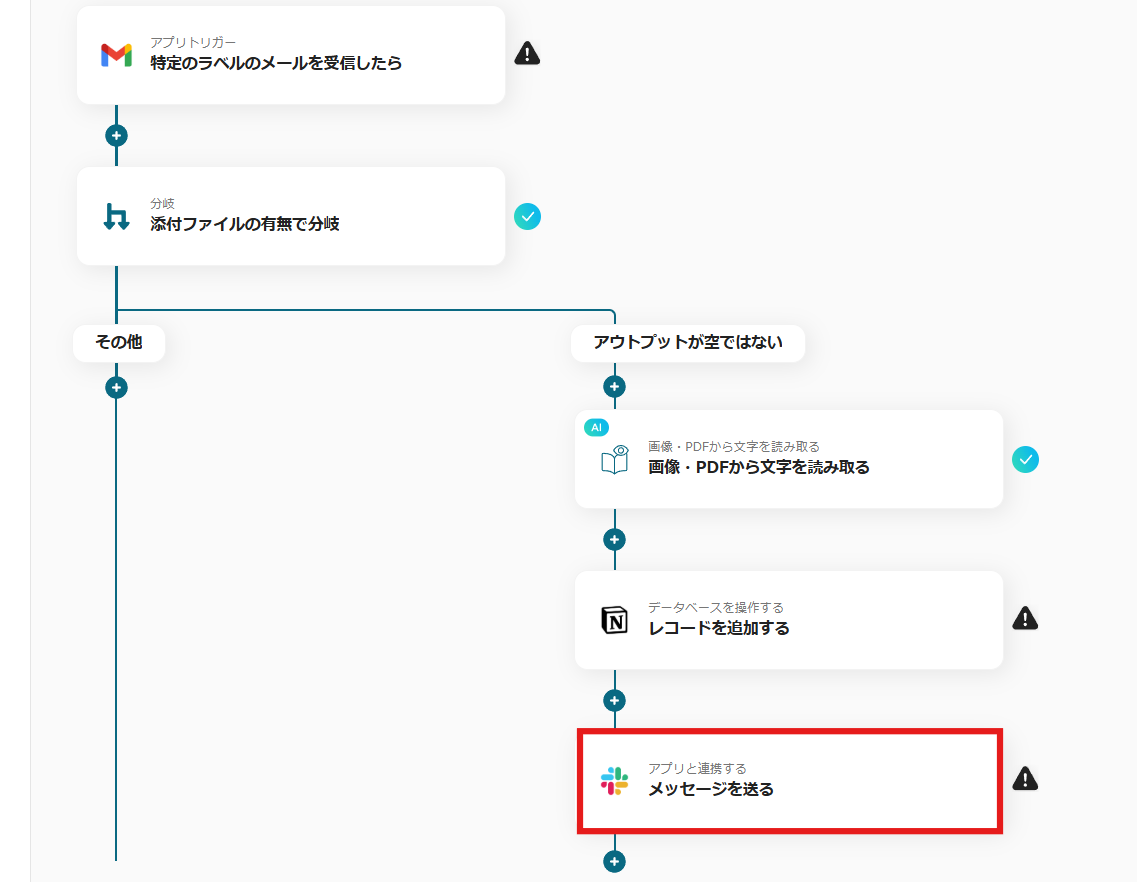 最後にコミュニケーションツールを入れ込むことで、請求書を受信したこと、Notionに格納したことの2つを通知できます。