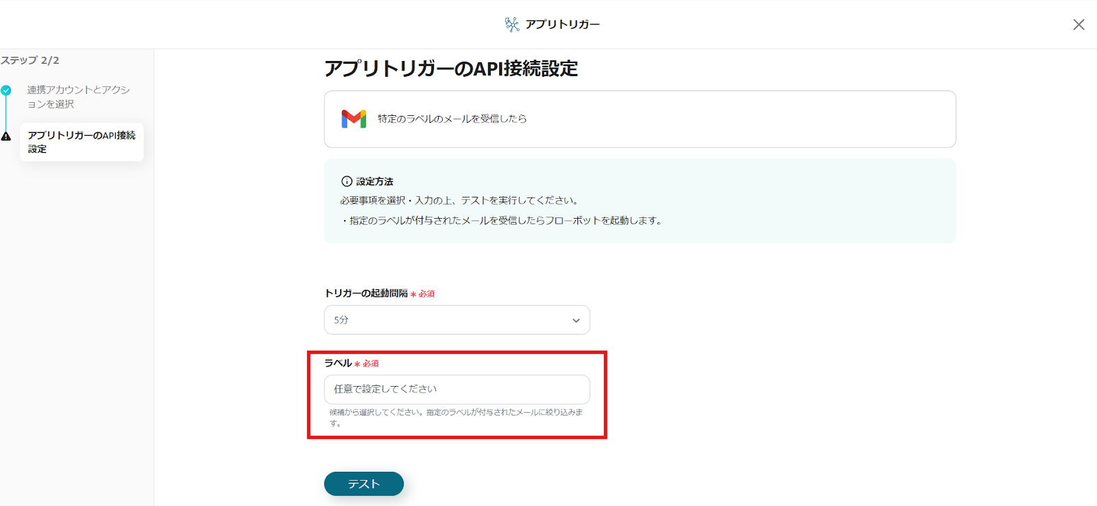 トリガーは5分、10分、15分、30分、60分の間隔で起動間隔を選択できます。