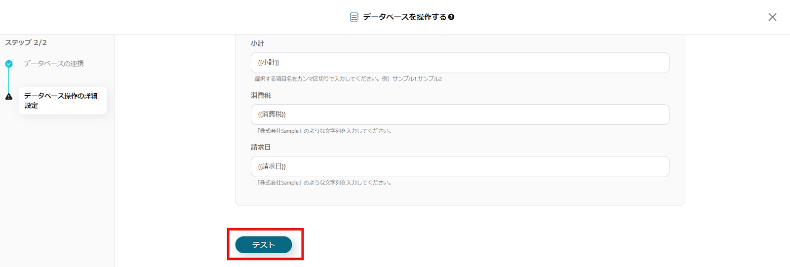 必要な項目を埋めたら、画面下部にあるテストボタンを押しましょう。