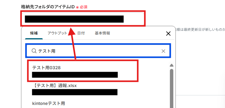 アウトプットとは、トリガーやオペレーション設定時に、「テスト」を実行して取得した値のことを指します。