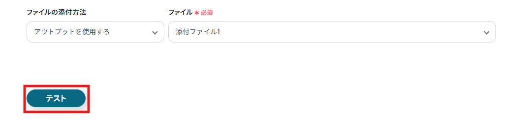 (7) 「ファイルの添付方法」は「アウトプットを使用する」を選択し、「ファイル」は「添付ファイル1」を選択します。
