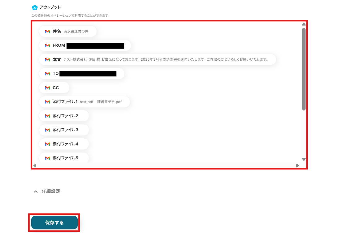 送信後は「テスト」をクリックし、「アウトプット」に送信したメールの内容やファイルが抽出されていることを確認しましょう。確認後、「保存する」をクリックして設定完了です。