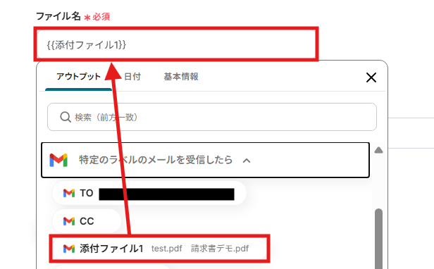 「アウトプット」の「特定のラベルのメールを受信したら」の「添付ファイル1」から、メール受信時の添付ファイル名を自動で引用できます。