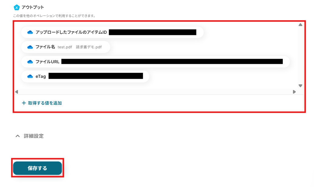 (8) 「テスト」をクリックしてテストが成功すると、「アウトプット」にファイルの格納情報が抽出されます。実際に、OneDriveにファイルが正しく格納されていることを確認しましょう。