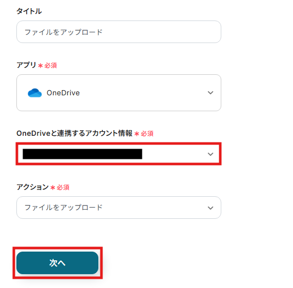 (2) 「OneDriveと連携したいアカウント情報」で、ファイルを保存する対象のOneDriveのアカウントを選択し、「次へ」をクリックします。