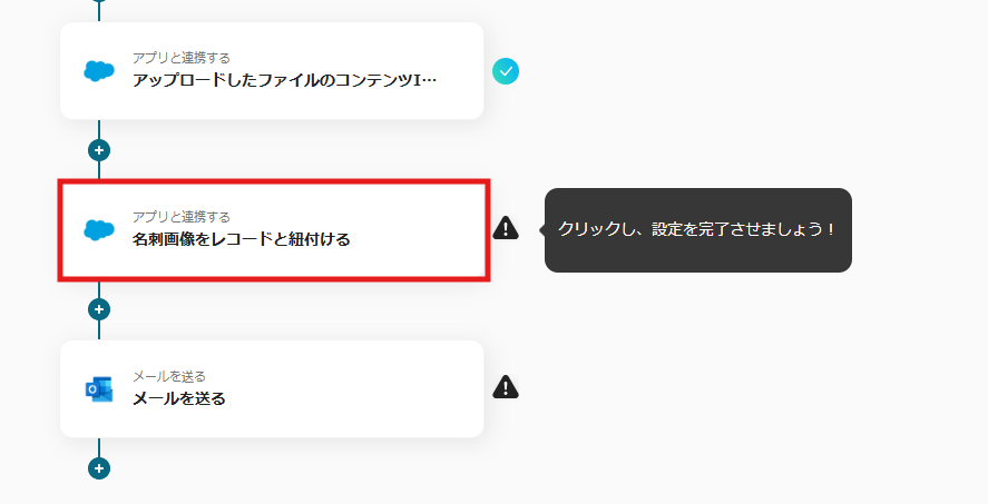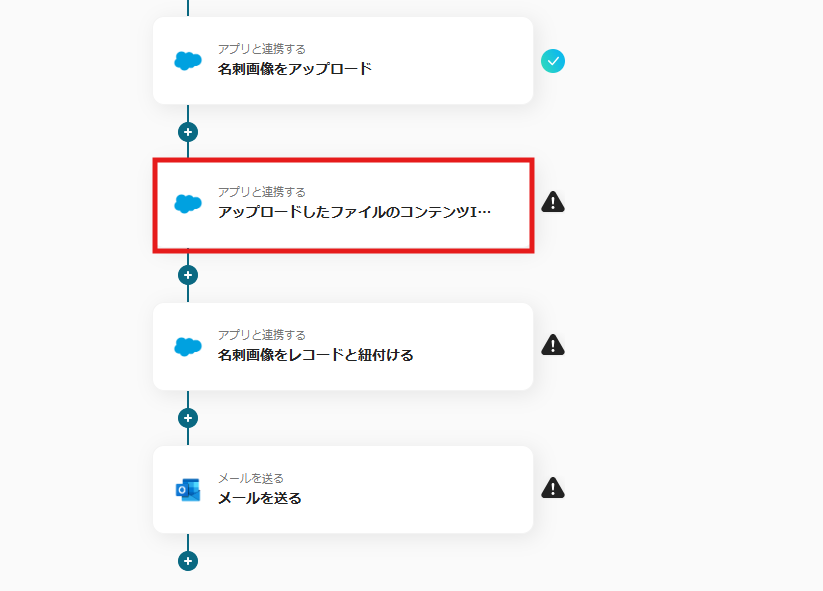 1) フローに戻り、「アプリと連携する 名刺画像をアップロードする」のアイコンをクリックします。