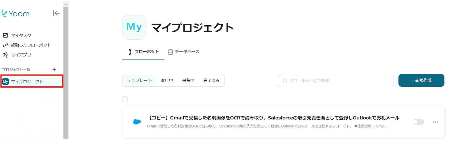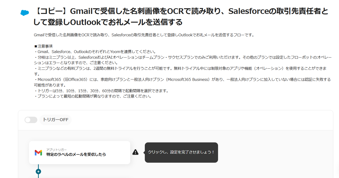 ここからは、Yoomのテンプレート【Gmailで受信した名刺画像をOCRで読み取り、Salesforceの取引先責任者として登録しOutlookでお礼メールを送信する】という連携フローを使って設定をしていきます。