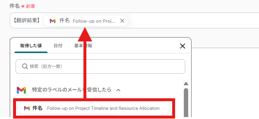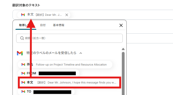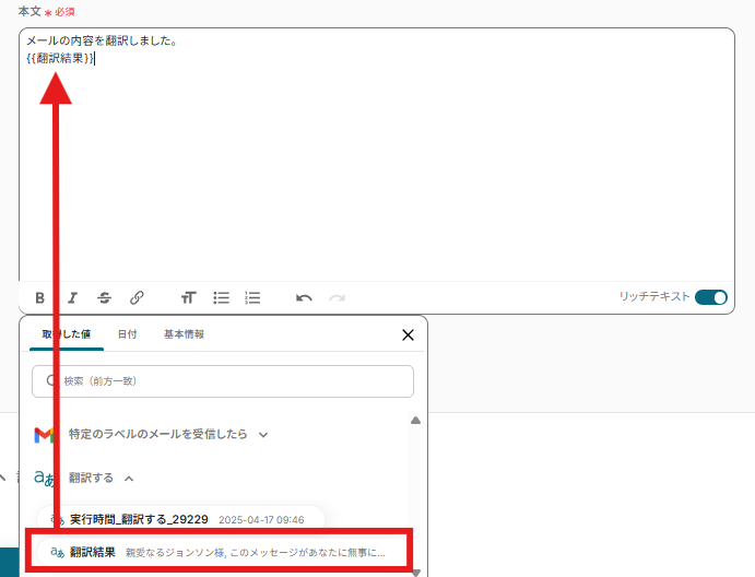 翻訳対象のテキストには、以下のように「取得した値」から「本文」をクリックしましょう。