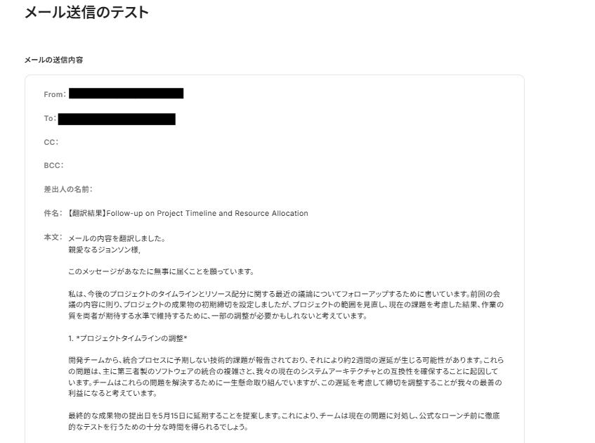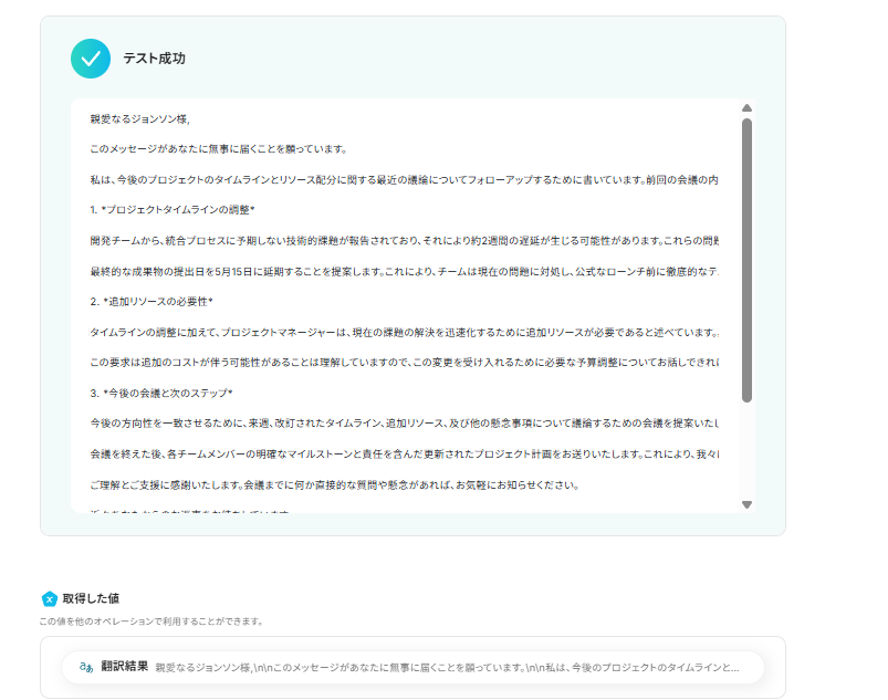 テスト成功すると、以下のように翻訳された文章が表示されます。