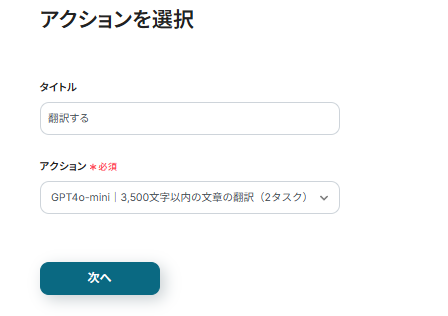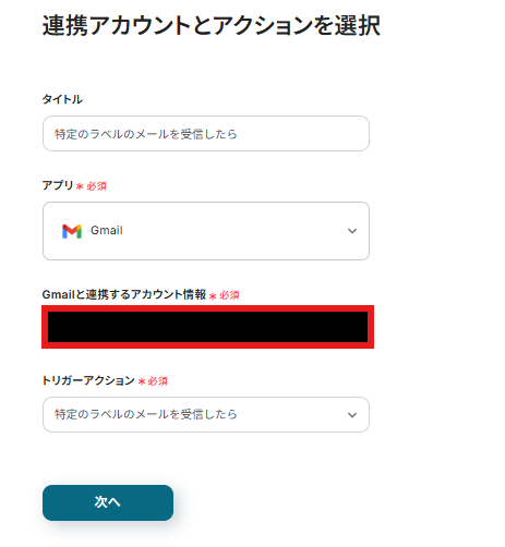 連携アカウントとアクションを選択する画面が表示されるので、今回連携するGmailのアカウントか確認し「次へ」をクリックしましょう。