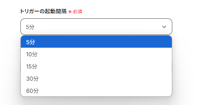 トリガーの起動間隔は5分・10分・15分・30分・60分から選択できます。