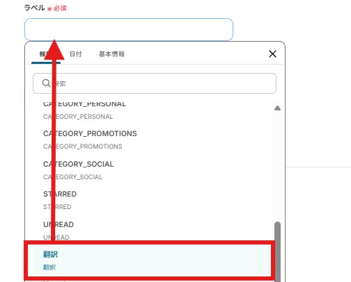 以下の画像の様に、入力欄をクリックし下に表示される「候補」から、メールの受信を検知したいラベルを選択しましょう。