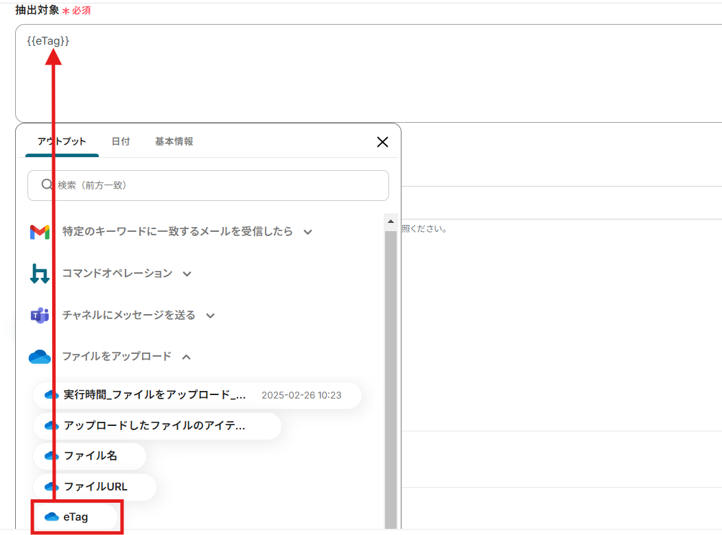 ファイルのGUIDはアウトプット(取得した値)から「{抽出した値」を選択しましょう。