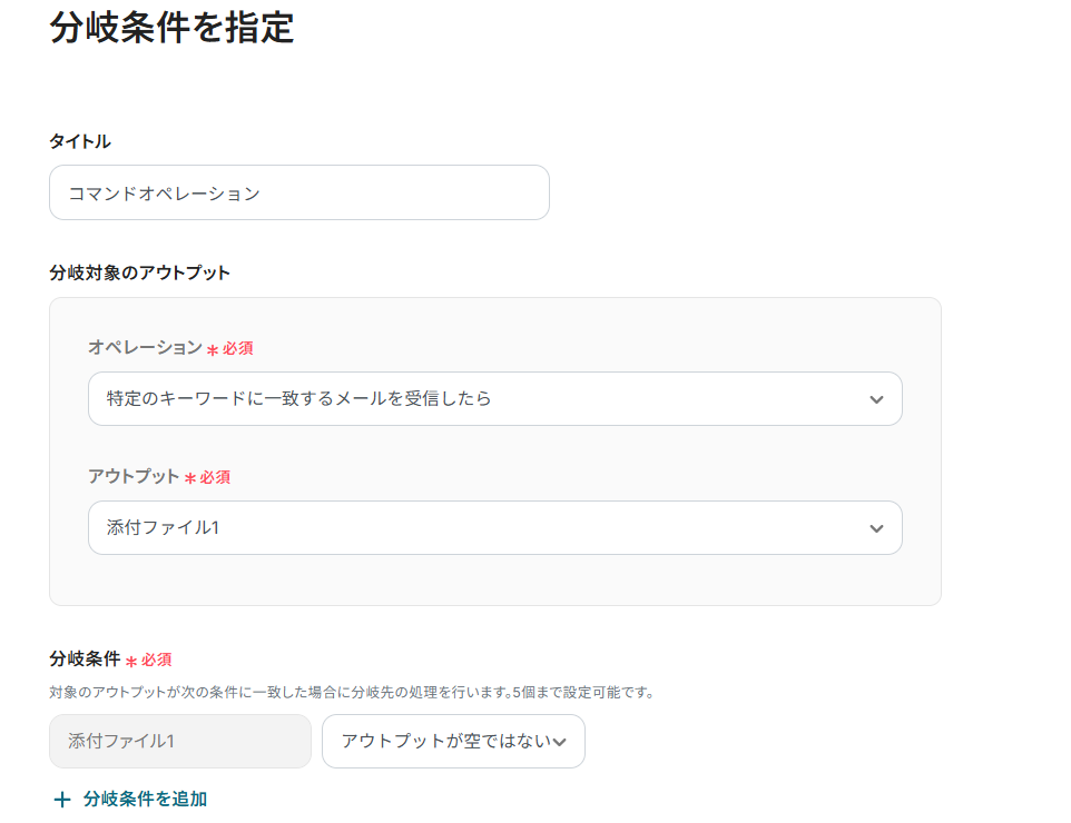 2) 分岐対象のアウトプットのオペレーションは「特定のキーワードに一致するメールを受信したら」、アウトプットは「添付ファイル1」を選択し、分岐条件が「添付ファイル1」 アウトプットが空ではない」になっていることを確認して「保存」をクリックします。