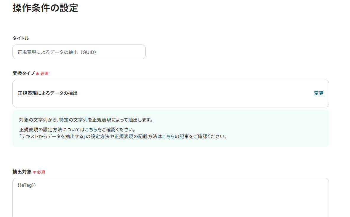 2) 変換タイプは「正規表現によるデータの抽出」を選択して、必須項目を入力します。