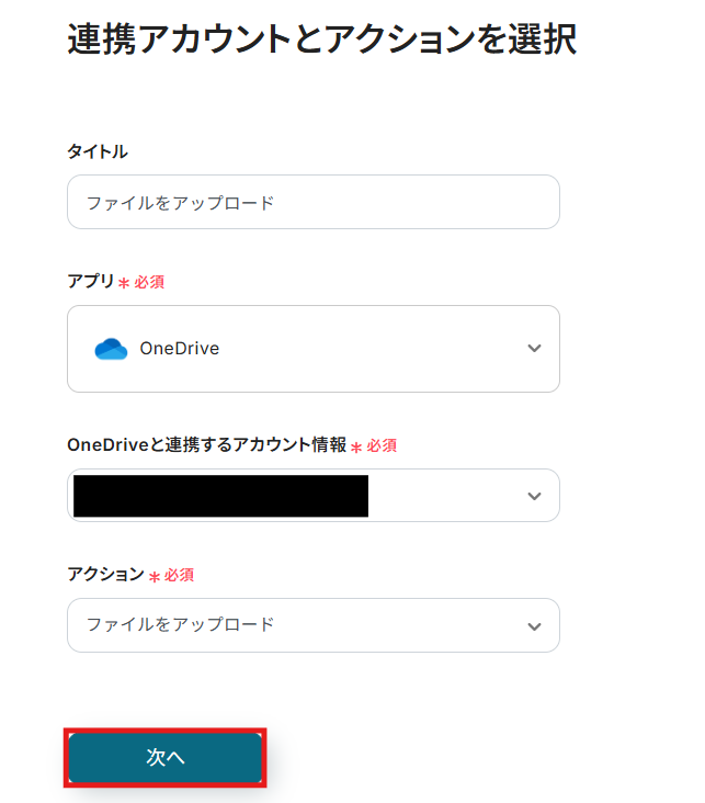 2) アクションは「ファイルをアップロード」を選択して、「次へ」をクリックします。