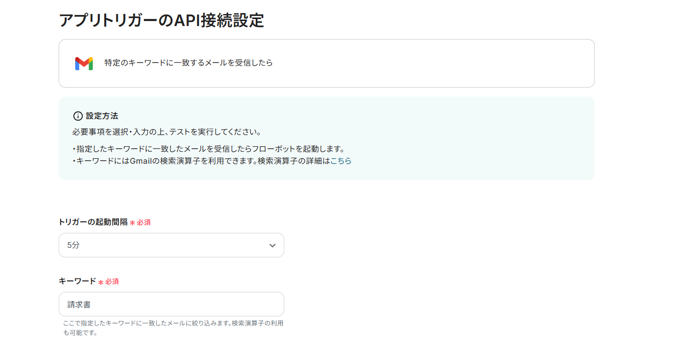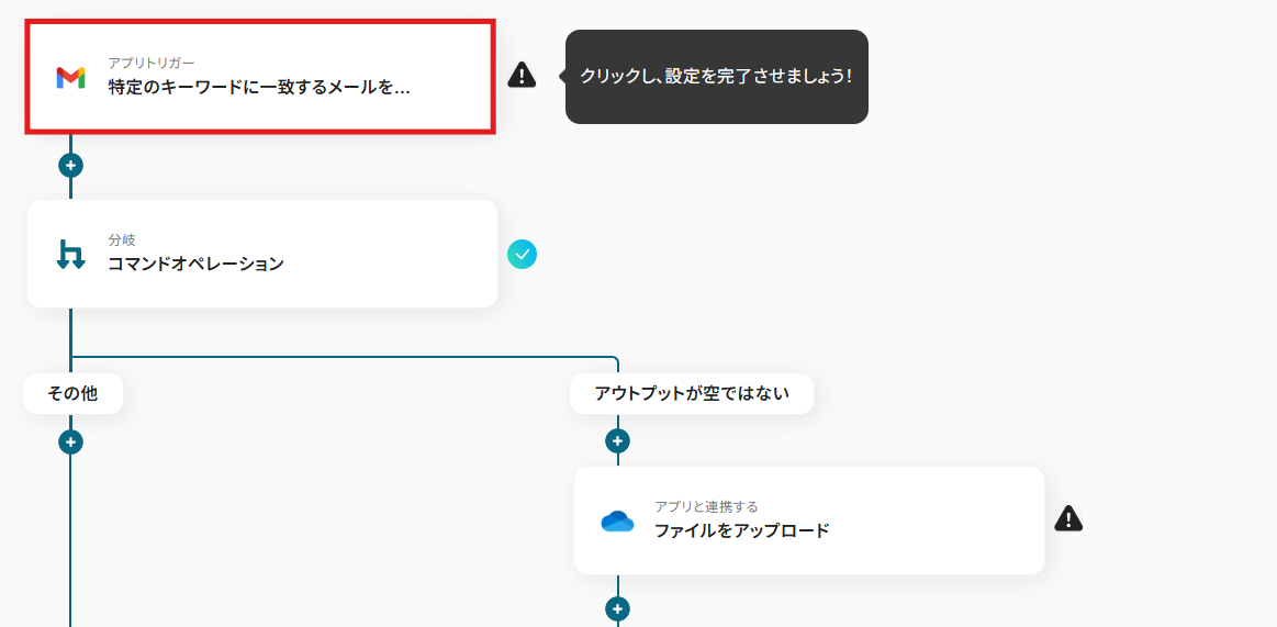 まずは「アプリトリガー 特定のキーワードに一致するメールを受信したら」をクリックしてみましょう!