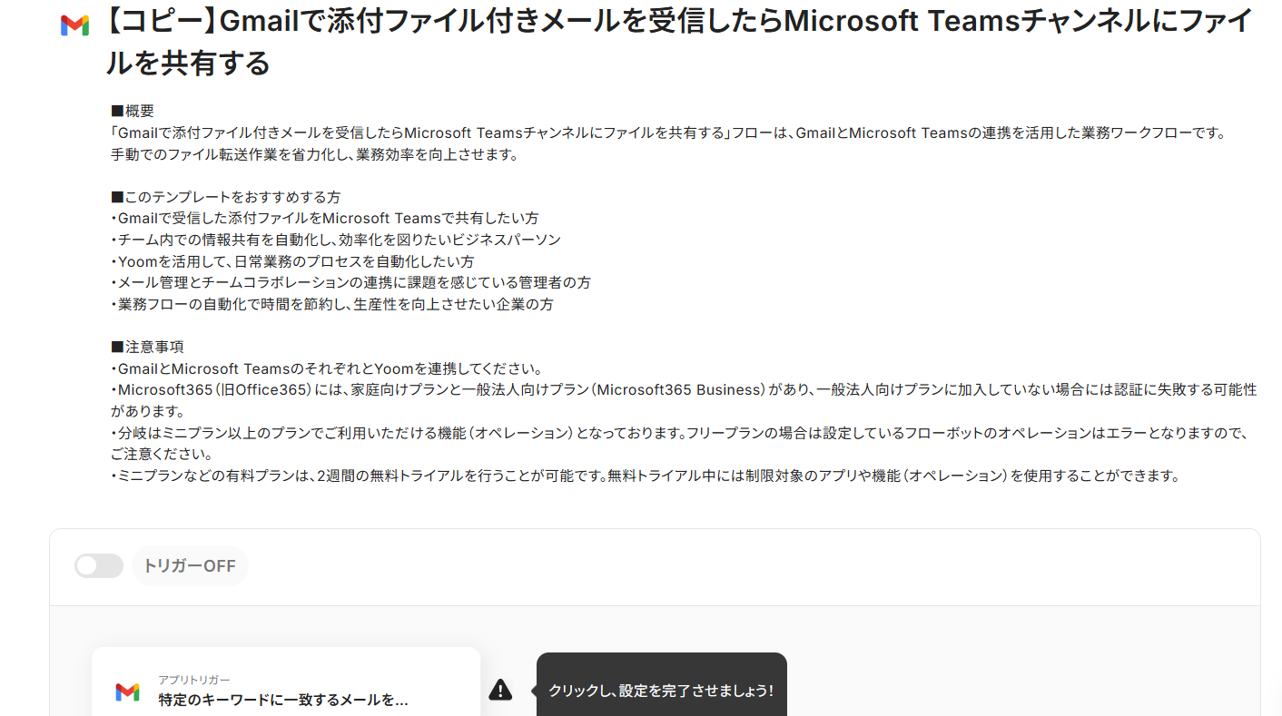 今すぐ試したい方は以下よりバナーをクリックしてスタートしましょう! ■概要 Gmailで受信したメールに添付されているファイルを、都度手動でMicrosoft Teamsのチャンネルに共有する作業は、手間がかかるだけでなく共有漏れのリスクも伴います。このワークフローを活用すれば、特定のGmailを受信するだけで、添付ファイルを自動でMicrosoft Teamsの指定チャンネルに共有できるため、こうした定型業務を効率化し、よりスムーズな情報連携を実現できます。 ■このテンプレートをおすすめする方 ■このテンプレートを使うメリット ■フローボットの流れ ※「トリガー」:フロー起動のきっかけとなるアクション、「オペレーション」:トリガー起動後、フロー内で処理を行うアクション ■このワークフローのカスタムポイント ■注意事項