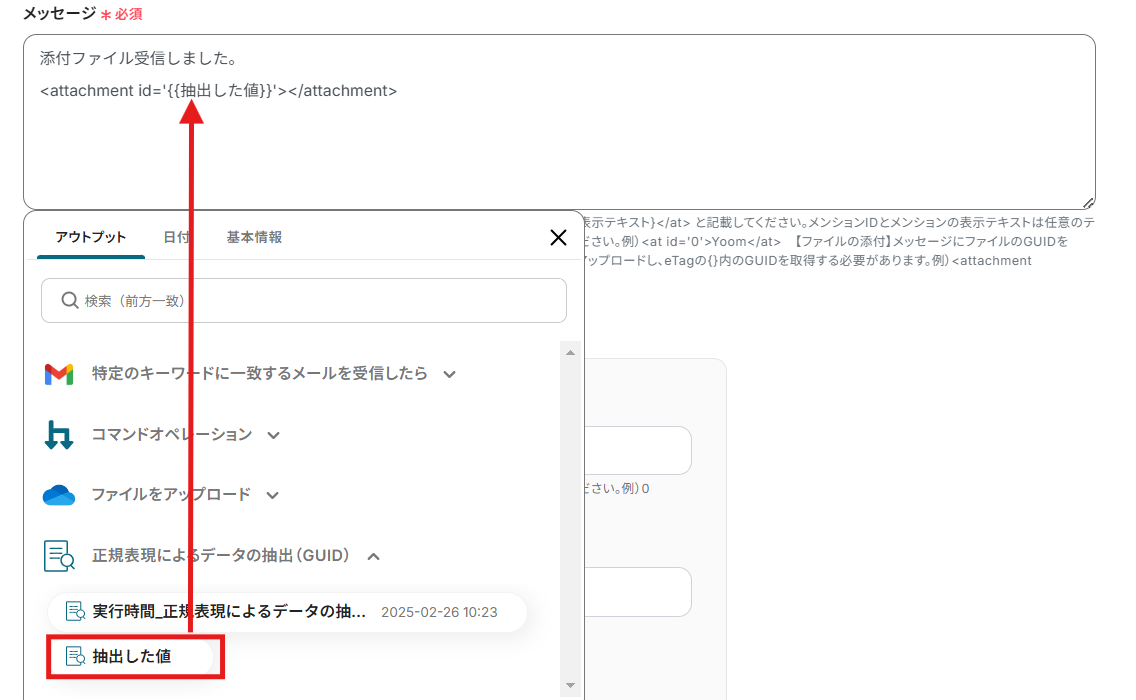 メッセージにはアウトプット(取得した値)を活用して入力できます。