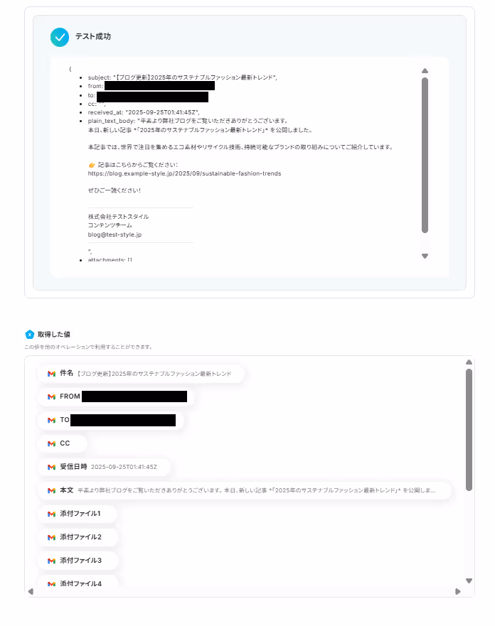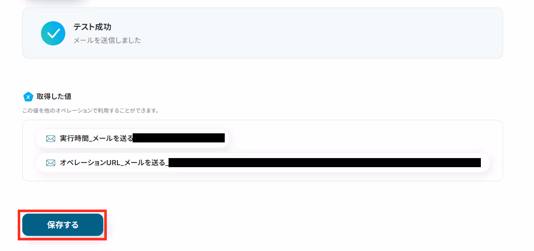 テストが成功すると取得した値が表示され、Gmailのデータが確認できます。「保存する」をクリックして完了です!