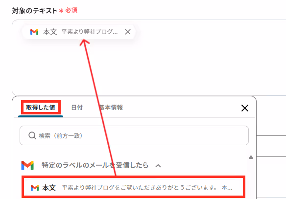 「対象のテキスト」は、取得した値からメール本文を選択しましょう。