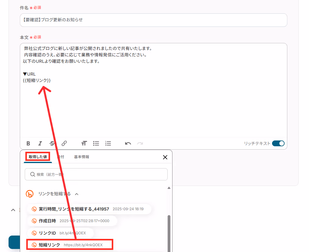「件名」と「本文」は、下記のように取得した値を利用して入力ができます。なお、取得した値を活用せずテキストを直接入力した箇所は固定値のため定型文となります。