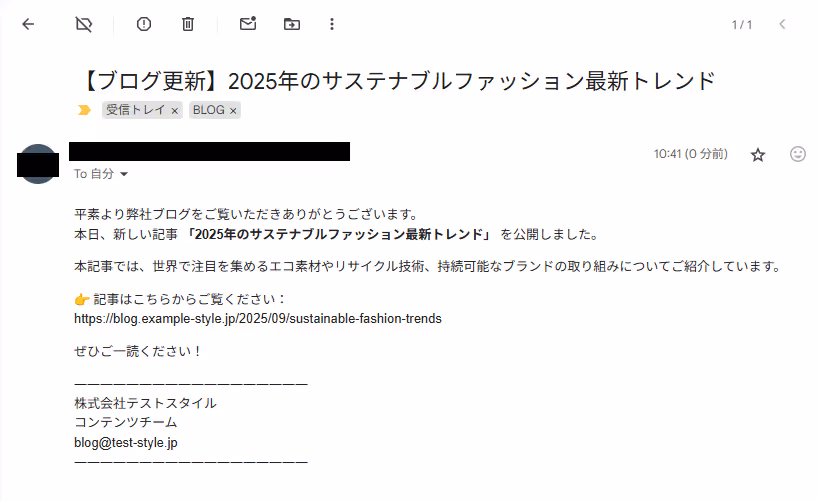 今回はフィルタールールを作成し、下記のメールが「BLOG」というラベルに振り分けられるように設定しました。