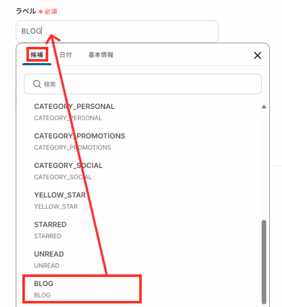 「ラベル」は、フローボットを起動したいラベルを候補から選択してください。