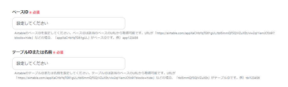 ベースID・テーブルIDまたは名前を、注釈を参考に入力してください。