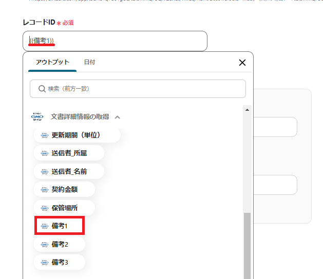 解説)ステップ1で登録したGMOサインの署名の「備考1」に「AirtableのレコードID」を入力しているため、上記のように設定することで、自動でAirtableのレコードIDを反映することができます。