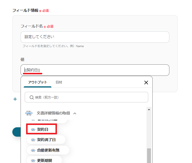 解説)上記のように設定することで、GMOサインに入力した「契約日」を自動でAirtableの値に反映することができます。