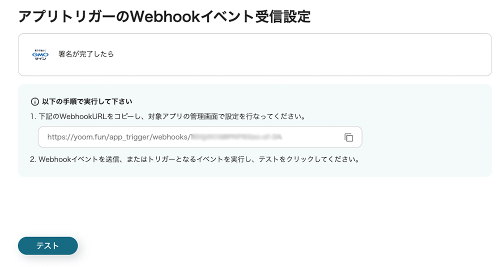 GMOサインでのイベント(署名の完了)をトリガーにするため、Webhookの設定を行います。