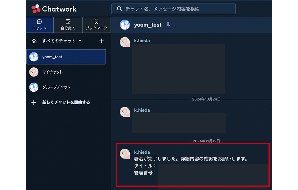 契約完了の通知がChatworkに届くことで、営業担当者は上司への報告がスムーズに行えます。通知には契約内容や期日といった重要な情報が含まれており、確認や手動での報告の手間が軽減されます。報告漏れのリスクも減り、上司も契約状況をすぐに把握できるため、やりとりが効率的です。担当者は、契約完了後の確認業務に集中できるため、次の対応にも素早く取りかかれる体制整備が見込めます。