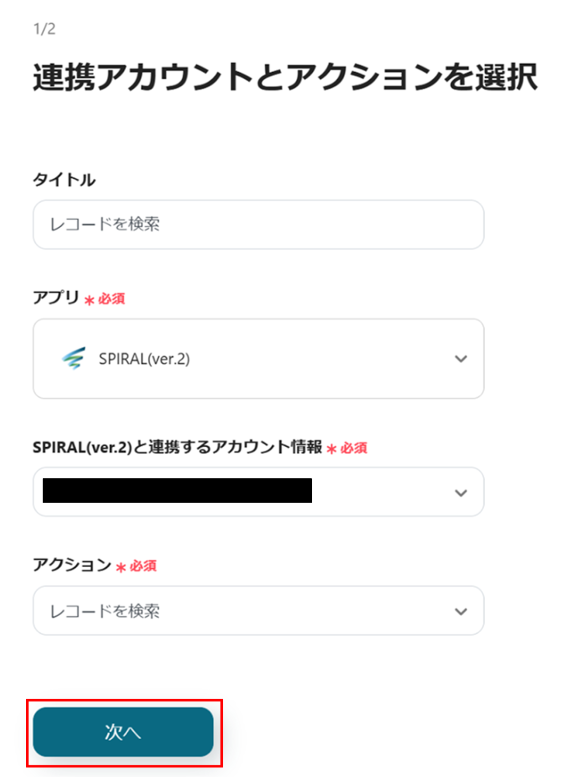 (2)SPIRALの「連携アカウントとアクションを選択」画面から、SPIRAL(ver.2)と連携するアカウント情報に誤りがないかを確認し、アクションは「レコードを検索」のままで「次へ」をクリックします。