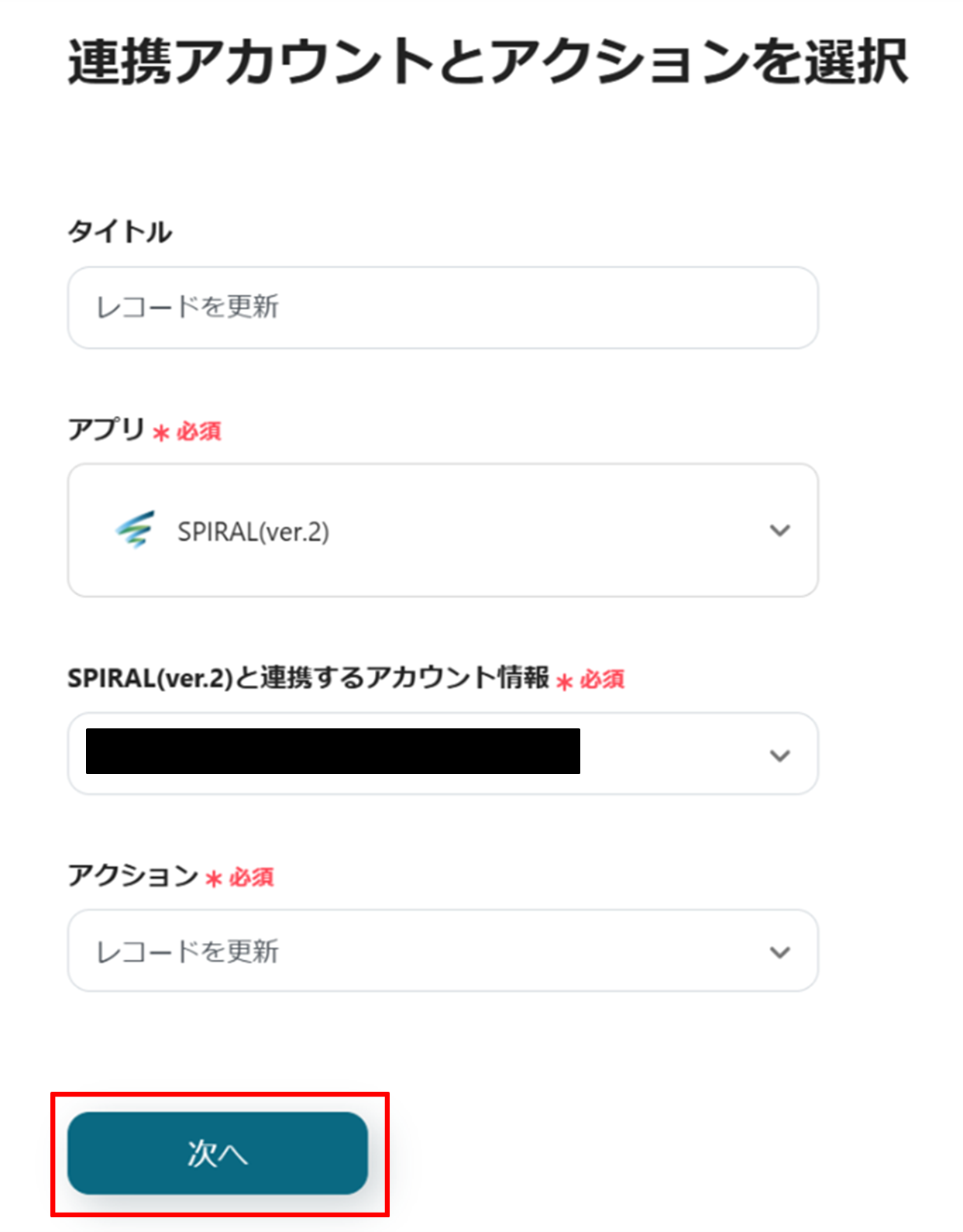 (2)「連携アカウントとアクションを選択」画面から、SPIRAL(ver.2)と連携するアカウント情報に誤りがないかを確認し、アクションは「レコードを更新」のままで「次へ」をクリックします。