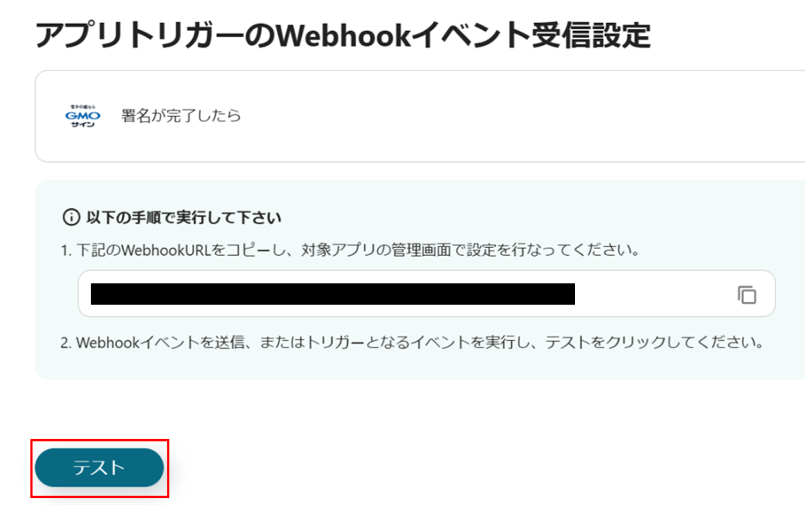 (3)「アプリトリガーのWebhookイベント受信設定」画面から、WebhookURLをコピーし、GMOサインの管理画面で設定を行ってください。