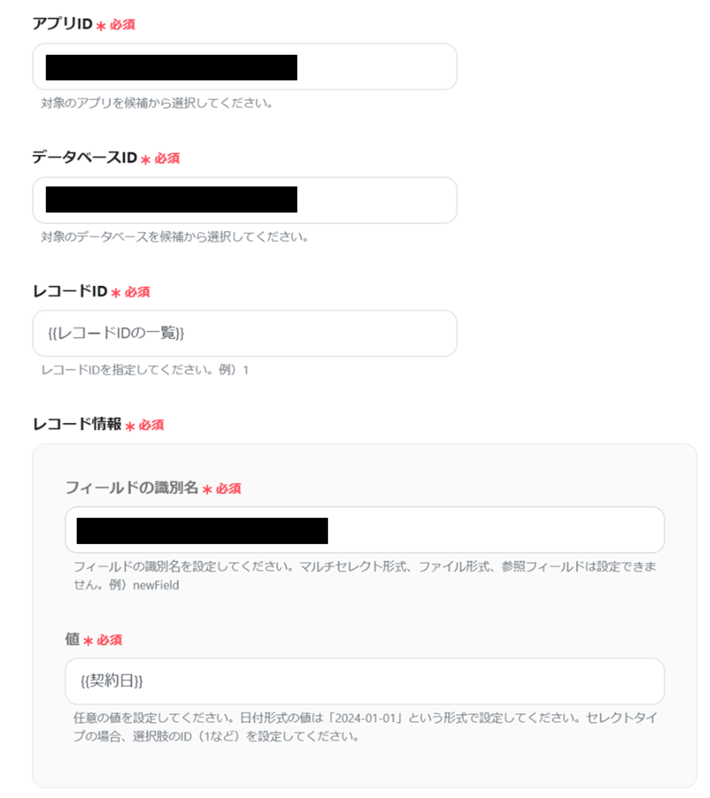 (3)「API接続設定」画面から、アプリID、データベースID、レコードID、フィールドの識別名、値を入力します。