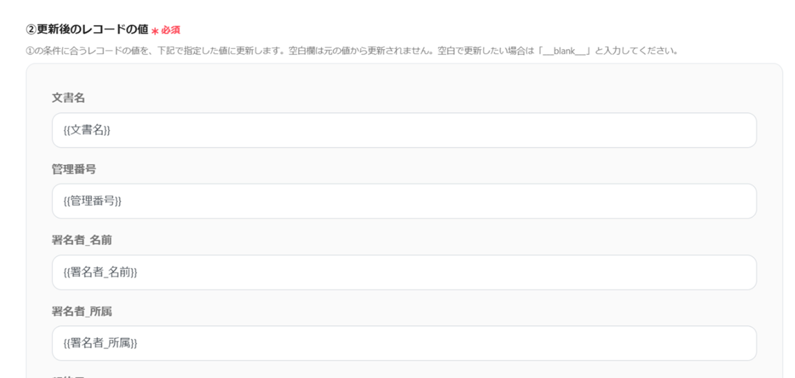 下へ進み、②更新後のレコードの値をアウトプットから選択します。