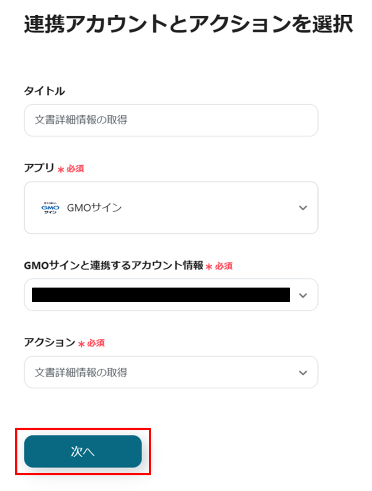 (2)「連携アカウントとアクションを選択」画面から、GMOサインと連携するアカウント情報に誤りがないかを確認し、アクションは「文書詳細情報の取得」のままで「次へ」をクリックします。