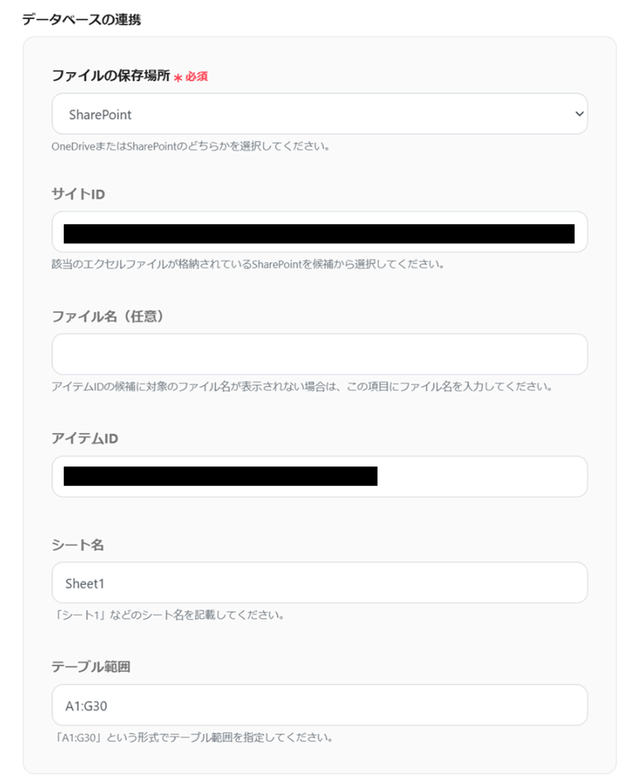 下へ進み、ファイルの保存場所、サイトID、ファイル名(任意)、アイテムID、シート名、テーブル範囲を入力します。
